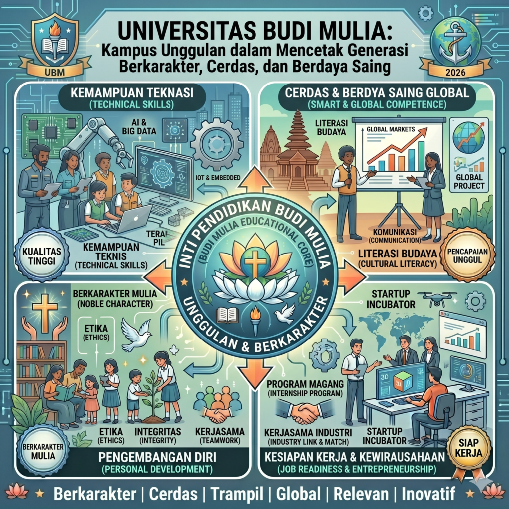 Universitas Budi Mulia dikenal sebagai salah satu perguruan tinggi yang berkomitmen dalam mencetak generasi unggul yang tidak hanya cerdas secara akademik, tetapi juga memiliki karakter yang kuat. Dengan visi menjadi kampus unggulan, universitas ini terus berupaya menghadirkan pendidikan yang berkualitas dan relevan dengan kebutuhan dunia modern serta perkembangan global.